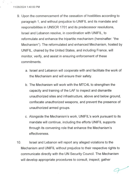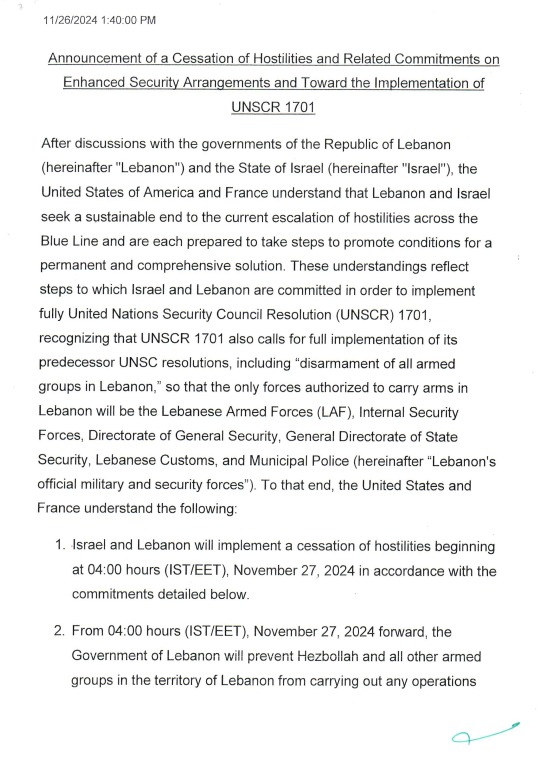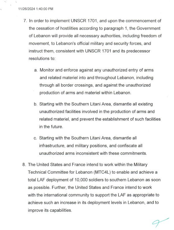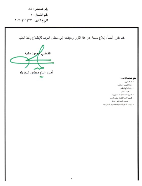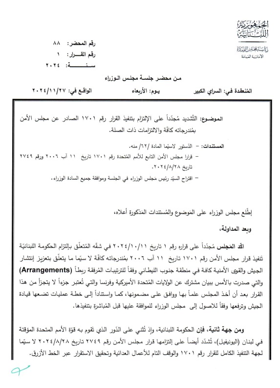 جدّد مجلس الوزراء التأكيد على قراره الرقم 1 تاريخ 11/10/2024، في شقه المتعلّق بالتزام الحكومة تنفيذ قرار مجلس الامن رقم 1701 تاريخ 11 آب 2006 الصادر عن مجلس الأمن الدولي بمندرجاته كافة والالتزامات ذات الصلة.