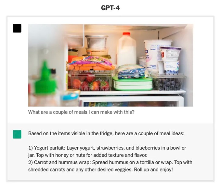 في هذا الإطار، اختبرت صحيفة "نيويورك تايمز" الميزة من خلال عرض صورة ثلاجة مفتوحة مع السؤال عن الوجبات التي يُمكن تحضيرها باستخدام المكوّنات الموجودة ليأتي "جي بي تي 4" ببعض الأمثلة بناءً على المحتويات.