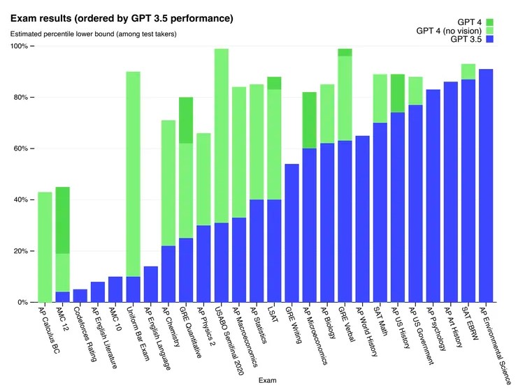 كانت إحدى أبرز النقاط في التقرير هي أداء النموذج في مجموعة من الاختبارات المعيارية، بما في ذلك "BAR" و"LSAT" و"GRE" وغيرها. وبالرغم من ذلك، نشرت الشركة أن "جي بي تي 4" لا يزال يعاني مع الاختبارات التي تتطلّب المزيد من الإبداع، كامتحانات اللغة الإنكليزية والأدب الإنكليزي.