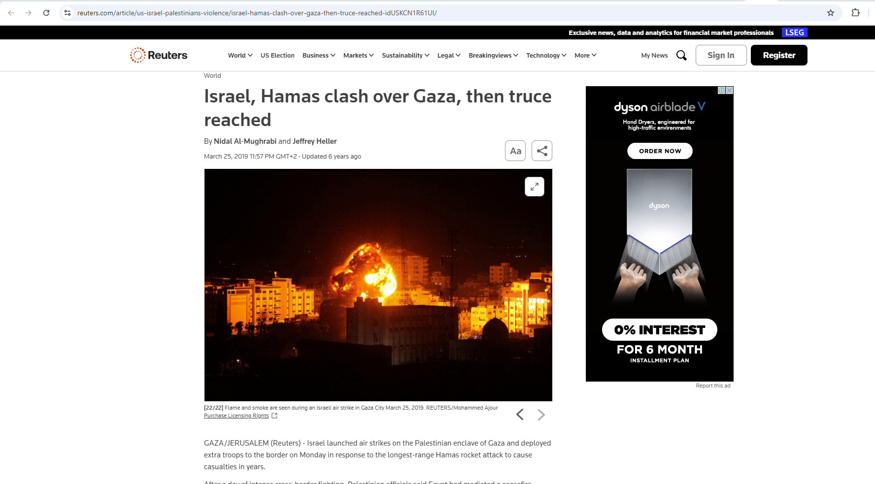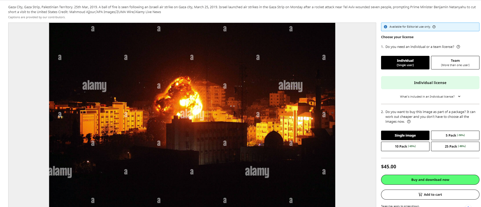 ويكفي بحث عكسي سريع للوصول اليها مؤرشفة، بحجمها الكامل، في موقع وكالة "رويترز"، مع شرح انها تظهر "ألسنة لهب ودخانا خلال غارة جوية إسرائيلية على مدينة غزة، في 25 آذار 2019".