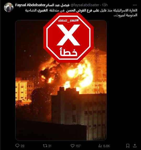 هذه الصورة لا تظهر لحظة استهداف فرع القرض الحسن بالغبيري في بيروت بغارة إسرائيليّة الأحد Factcheck#