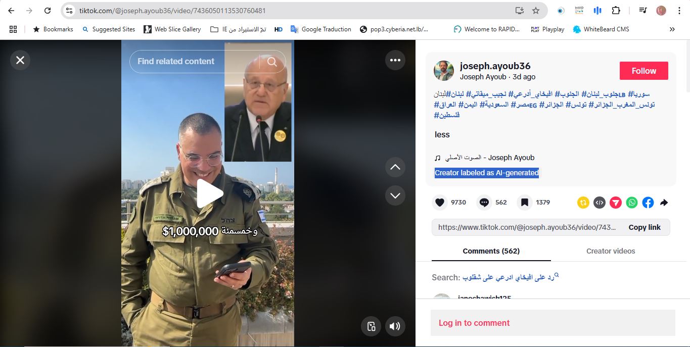 في الواقع، يقودنا البحث عن الفيديو، بتجزئته الى مشاهد ثابتة (Invid)، الى حساب joseph.ayoub36@ في تيك توك الذي نشره قبل نحو ثلاثة ايام، مع اشارة الى انه مولد بواسطة برنامج ذكاء اصطناعي AI.