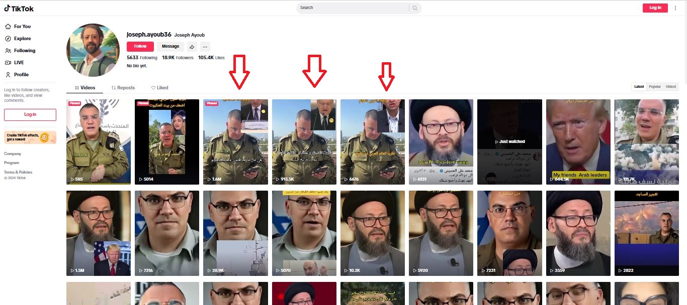 جولة في الحساب تبين انه ينشر العديد من الفيديوات الزائفة، المتلاعب بها، والتي يظهر فيها ادرعي معلقا على كلمة الرئيس المصري عبد الفتاح السيسي امام قمة الرياض، وعلى عمرو اديب، مستخدما الفيديو الاصلي ذاته المنشور في 3 تشرين الثاني 2024... اضافة الى فيديوات مفبركة للرئيس الاميركي المنتخب دونالد ترامب، والشيخ محمد علي الحسيني وادرعي...