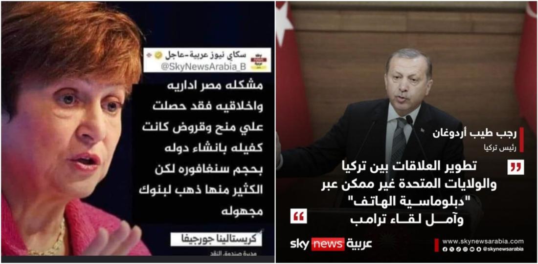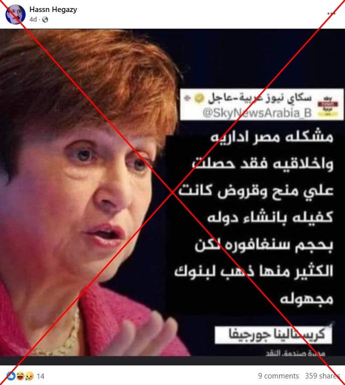 تتضمّن المنشورات تصريحاً منسوباً لمديرة صندوق النقد كريستالينا غورغييفا جاء فيه: "مشكلة مصر إدارية وأخلاقية، فقد حصلت على منح وقروض كانت كفيلة بإنشاء دولة بحجم سنغافورة، لكن الكثير منها ذهب لبنوك مجهولة". ويظهر على الصورة المتداولة شعار قناة "سكاي نيوز  عربيّة".
