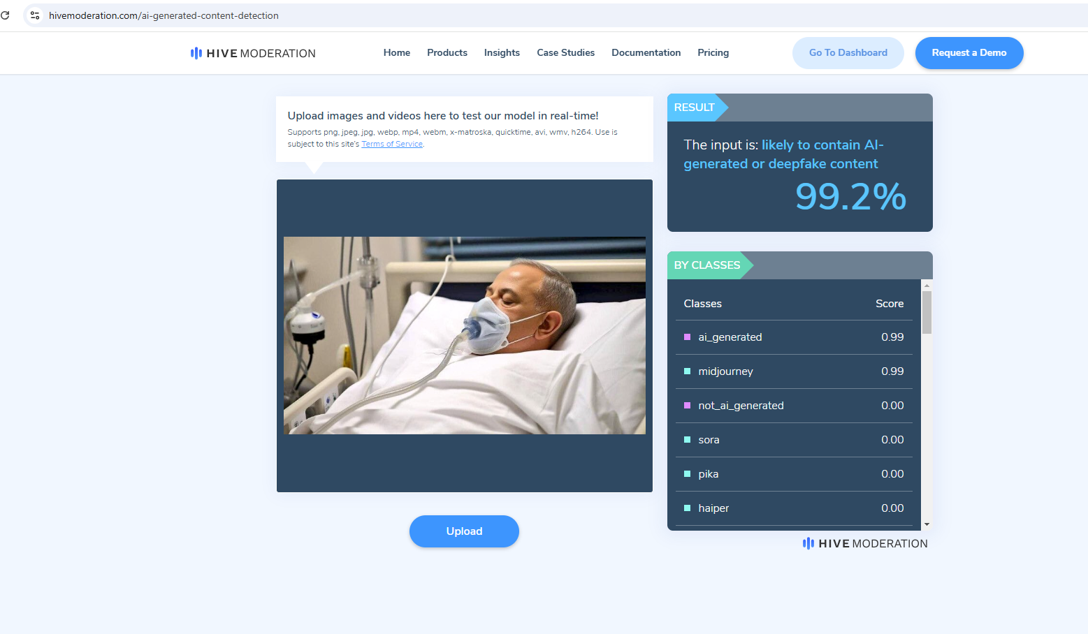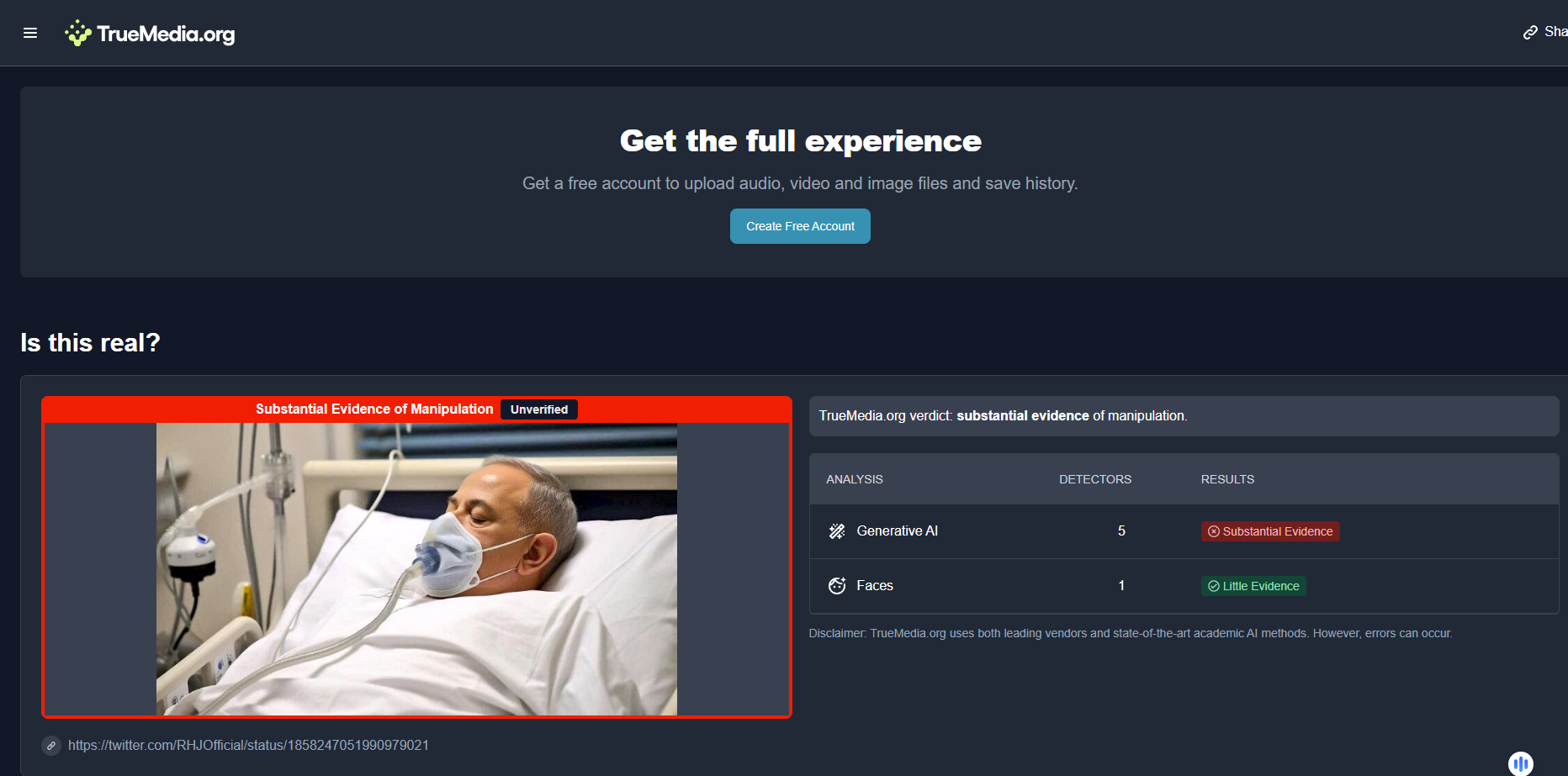 وغياب الصورة يعزّز الشكوك حول صحتها. وباخضاعها للفحص في موقعي Hive Moderation وTrue Media المتخصصين بكشف الصور المنشأة بالذكاء الاصطناعي، كانت النتيجة انها احتوت على ادلة قوية على تلاعب، والارجح انها AI بنسبة 99.2%.