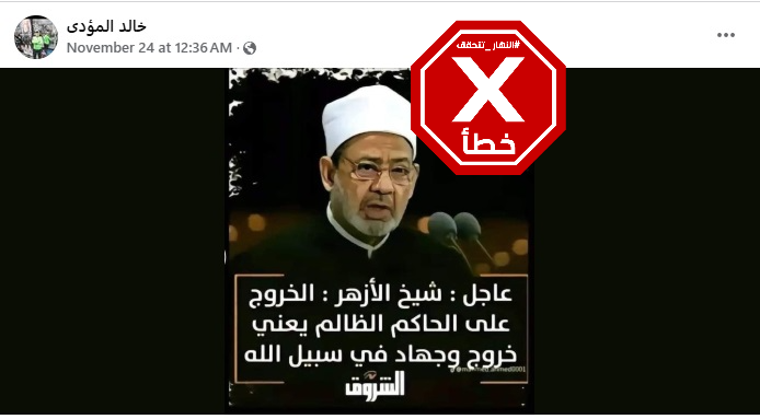 فقد تداولت حسابات على فايسبوك وإكس تصريحا منسوبا إلى الإمام الأكبر الدكتور أحمد الطيب، شيخ الأزهر الشريف ورئيس مجلس حكماء المسلمين، في قالب إخباري لموقع جريدة "الشروق" المصرية (مستقلة)، يقول: "عاجل- شيخ الأزهر: الخروج على الحاكم الظالم يعني خروج وجهاد في سبيل الله".