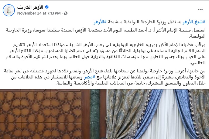 ثانياً: تم تداول الخبر المزعوم في 24 تشرين الثاني (نوفمبر) 2024. وفي هذا التاريخ، التقى الإمام الأكبر الدكتور أحمد الطيب وزيرة الخارجية البوليفية سيليندا سوسا في مشيخة الأزهر.