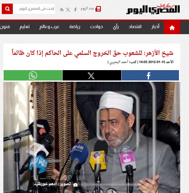 وتجدر الإشارة إلى أن هناك تصريحات نشرتها المواقع الإخبارية المصرية، في 15 كانون الثاني 2012، أكد فيها الإمام الطيب "حق الشعوب في الخروج السلمي على الحاكم، إذا كان فاسدا وظالما، شرط عدم رفع السلاح كي لا يؤدي إلى فتنة كبرى أو حرب أهلية".