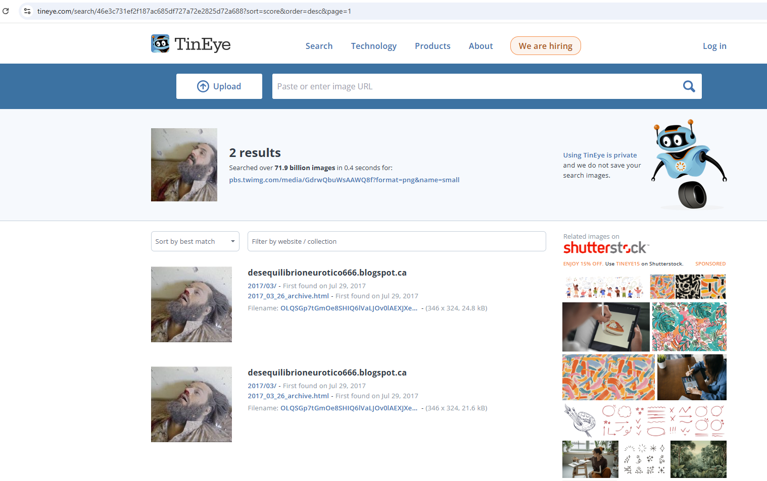 لان البحث العكسي، بواسطة محرك Tineye، يوصلنا أولا الى الصورة الاصلية منشورة في مدونة في 29 تموز 2017. ويظهر فيها رجل فتح عينيه وفمه، بينما غطى الدم انفه، وملأ الغبار شعره ولحيته... من دون اي تفاصيل عنه.