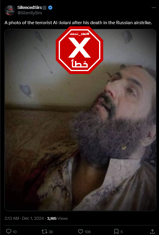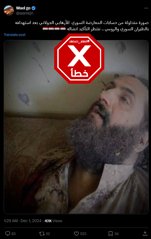 الصورة المتداولة لا تظهر زعيم هيئة تحرير الشام أبو محمد الجولاني بعد مقتله FactCheck#