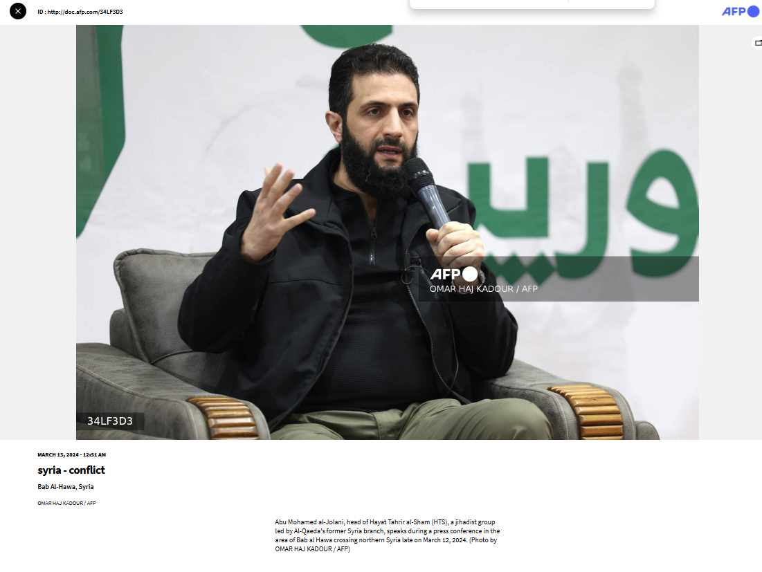 صورة للجولاني ملتقطة في 12 آذار 2024، خلال مؤتمر صحافي في منطقة معبر باب الهوى شمال سوريا (أ ف ب).