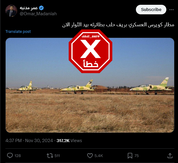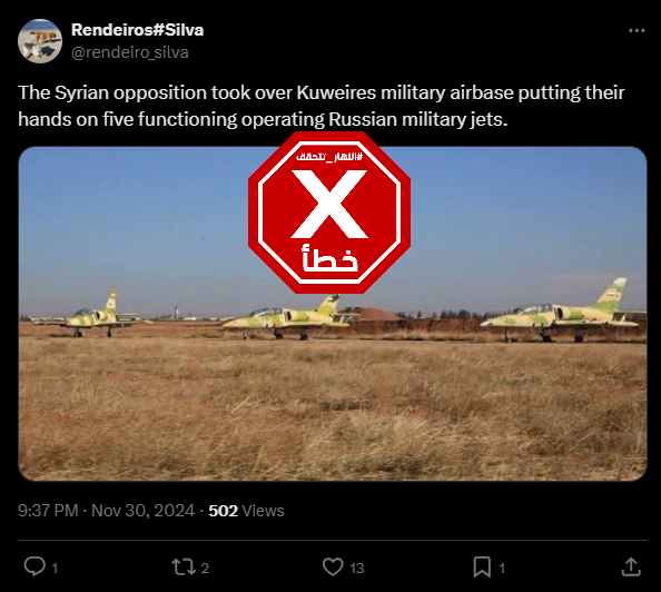 تظهر الصورة ثلاث طائرات عسكرية توقفت في مكان ما. وقد انتشرت أخيرا في حسابات، عربية وانكليزية، بالمزاعم الآتية (من دون تدخل): "مطار كويرس العسكري بريف حلب وطائرته بيد الثوار الآن".
