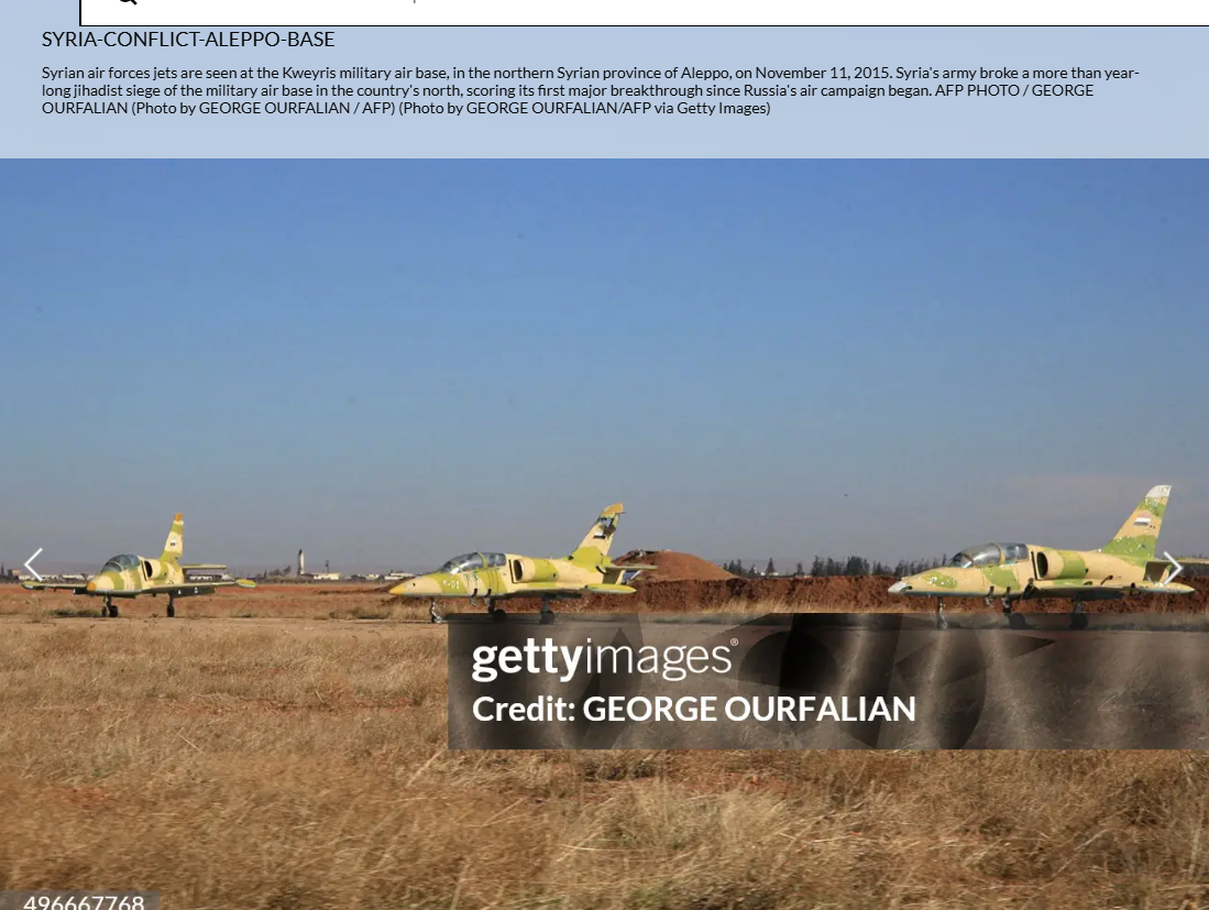 فالبحث العكسي يوصلنا الى خيوط تقودنا الى الصورة مؤرشفة في موقع وكالة غيتي ايماجيز Getty Images، في 11 تشرين الثاني 2015، مع شرح انها تظهر طائرات تابعة للقوات الجوية السورية في قاعدة كويرس الجوية العسكرية في محافظة حلب شمال سوريا، في 11 تشرين الثاني 2015".