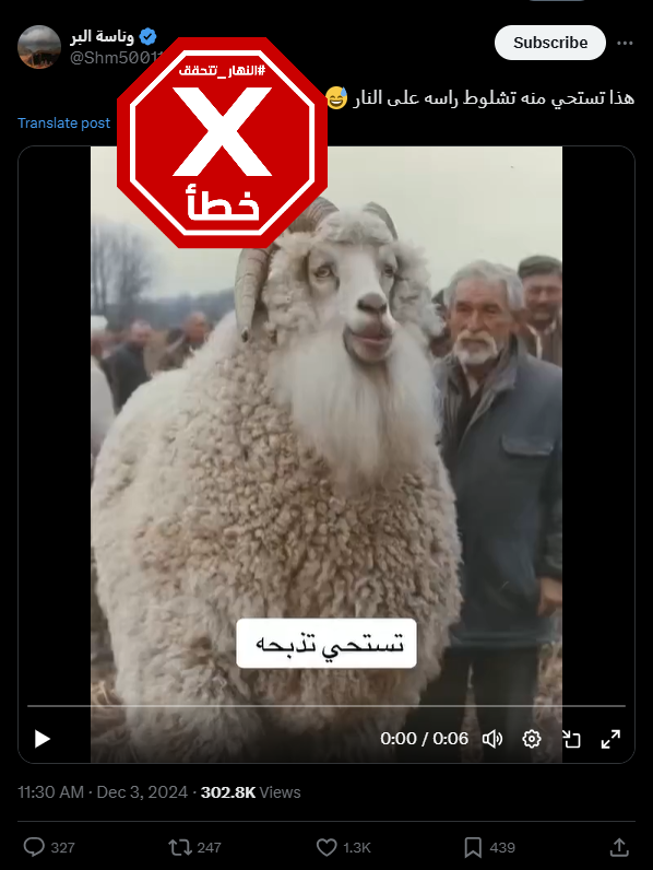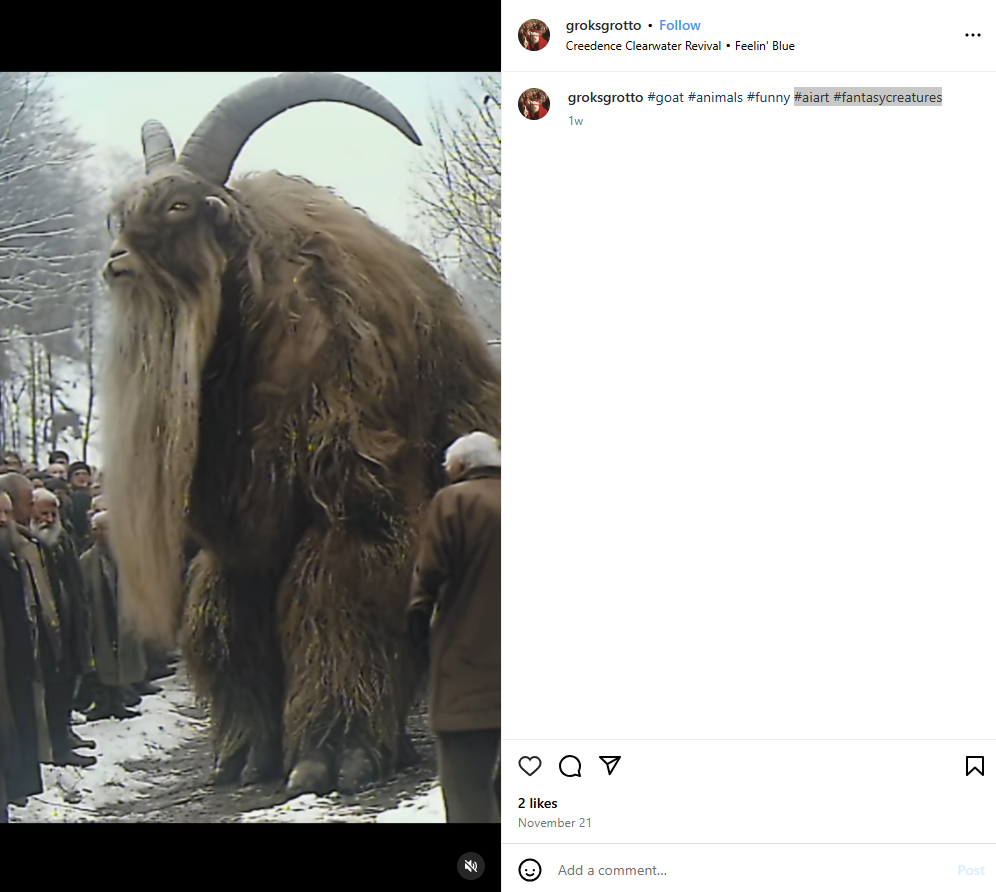 تقييمنا النهائي: اذاً، ليس صحيحاً ان "الماعز الضخمة" في المقطع المتناقل حقيقية. في الواقع، نشر الفيديو حساب Grok's Grotto المتخصص بالذكاء الاصطناعي، في 22 تشرين الثاني 2024. وهو ينشئ فيديوات لحيوانات ضخمة مماثلة بواسطة الذكاء الاصطناعي، وينشرها بهذا الوصف.