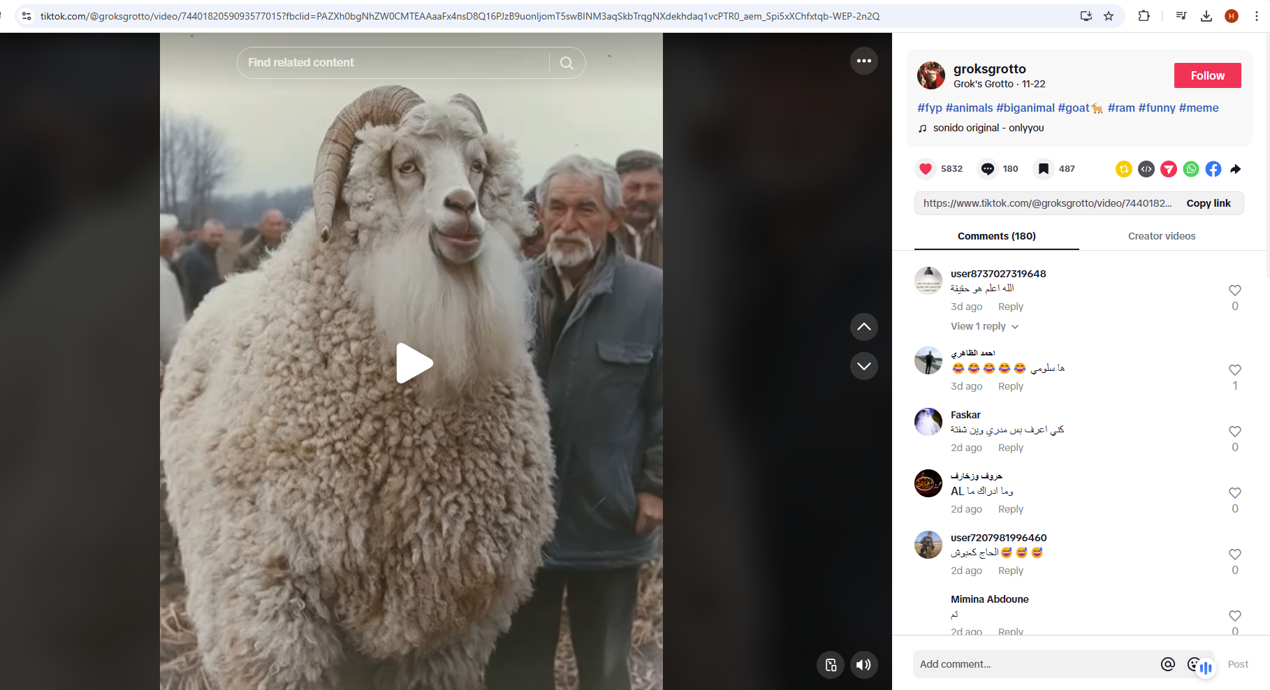 ويزخر حساباه في تيك توك وانستغرام بفيديوات تظهر فيها حيوانات ضخمة، على غرار تلك الماعز، وارفقها بوسوم، مثل AI اي ذكاء اصطناعي، وMidjourney (برنامج ميدجورني للذكاء الاصطناعي)، وAI Art اي فن الذكاء الاصطناعي. وبالتالي هذا ينسحب على مقطع الماعز الضخمة المتداول... وهذه المشاهد ليست حقيقية.