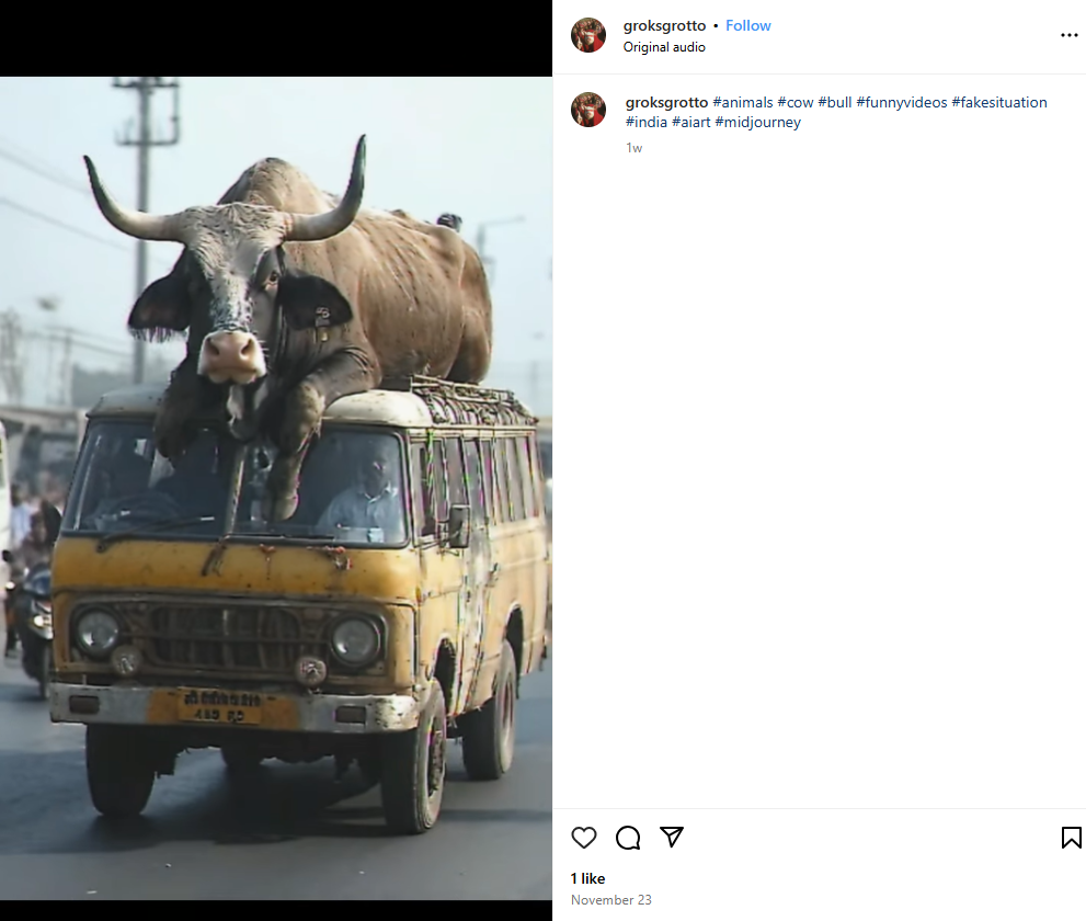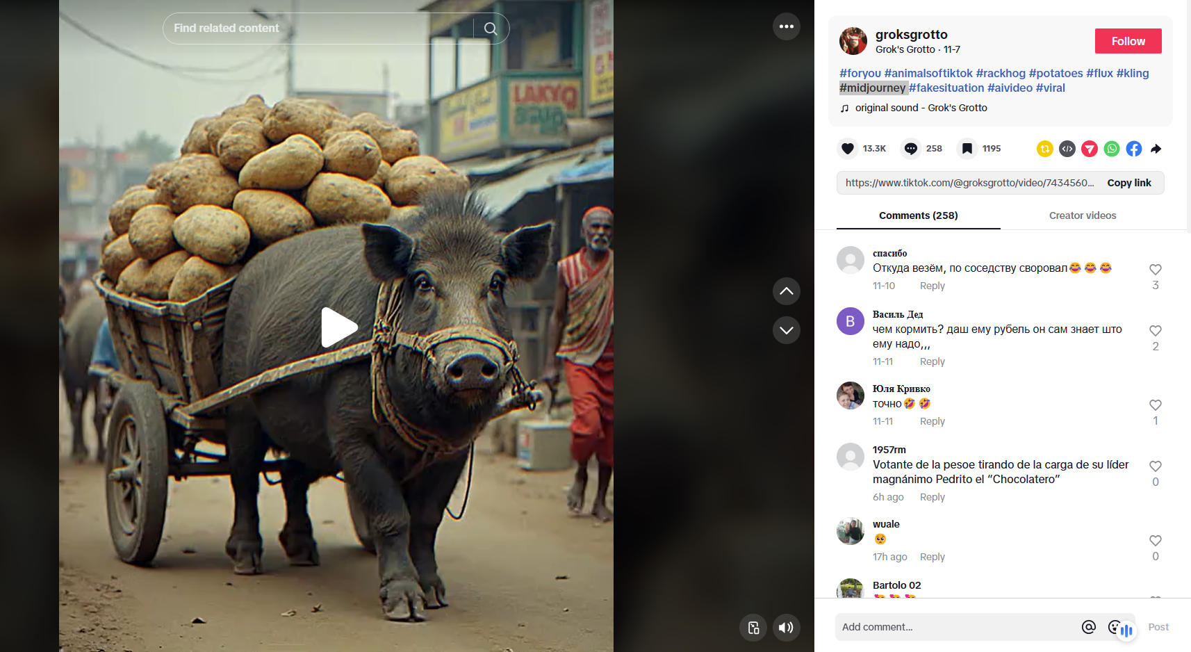 ويحسم الامر العثور على المقطع، بعد تجزئته الى مشاهد ثابتة (Invid)، في حساب groksgrotto /Grok's Grotto@ المتخصص بالذكاء الاصطناعي في تيك توك، والذي نشره في 22 تشرين الثاني 2024، مرفقا بوسوم مثل Funny (مضحك) وMeme (ميم).