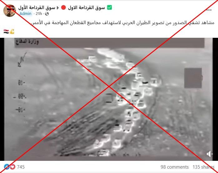 على وقع اشتباكات عنيفة بين الجيش السوريّ والفصائل المعارضة في شمال سوريا يتخللها غارات وقصف صاروخي ومدفعي، تداول مستخدمون لمواقع التواصل الاجتماعي فيديو زعم ناشروه أنّه لقصف تعرّضت له قافلة للفصائل المسلّحة متّجهة نحو مدينة حماه. إلا أنّ الفيديو يعود لهجومٍ شنّته القوات العراقيّة ضدّ مقاتلي تنظيم الدولة الإسلاميّة في الفلوجة عام 2016.