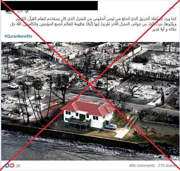 يعمل آلاف الإطفائيين في الولايات المتحدة على احتواء نيران أتت على أجزاء كاملة من لوس أنجليس، ثاني كبرى المدن الأميركية. وفي هذا السياق، تداولت صفحات وحسابات على مواقع التواصل باللغة العربية صورة قيل إنها تُظهر مركزاً إسلاميًا لتدريس القرآن نجا من الحرائق دون ما حوله من مبان. لكن هذا الادعاء من خيال مؤلّفه. فالصورة نشرتها وكالة "فرانس برس" عام 2023، وهي مصوّرة في هاواي، وليس في لوس أنجليس، والمبنى الظاهر فيها بيت قديم وليس مركزاً دينياً.