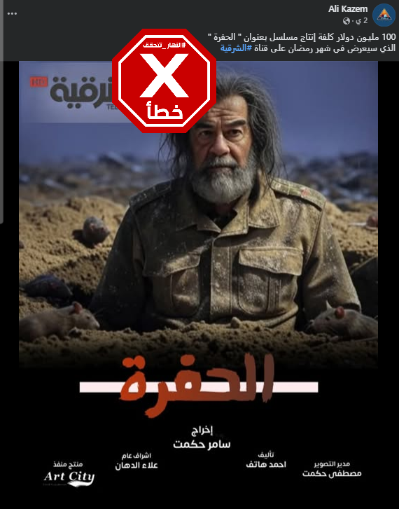 في الادّعاء المتداول، صورة لرئيس النظام العراقي السابق صدّام حسين، مع شعاري قناة "الشرقية" وشركة "مدينة الفن"، بمزاعم أنها "بوستر" لمسلسل يحمل عنوان "الحفرة"، وانه سيعرض على قناة "الشرقية" العراقية، وهو من اخراج سامر حكمت، من تأليف أحمد هاتف... وكتبت مصادر الادعاء مع الصورة (من دون تدخّل): "100 مليـون دولار كلفة إنتاج مسلسل بعنوان الحفرة سيعرض في شهر رمضان على قناة الشرقية".