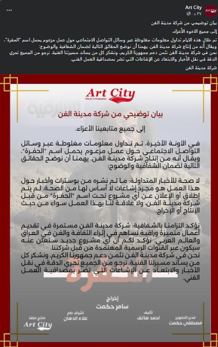 وأكّدت الشركة التزامها الشفافية واستمرارها في "تقديم أعمال متميزة وراقية تساهم في إثراء الثقافة والفن في العراق والعالم العربي". وقالت: "نؤكد لكم أن أي مشروع جديد سنعلنه سيكون عبر القنوات الرسمية المعتمدة من شركتنا. نحن في شركة مدينة الفن نثمن دعم جمهورنا الكريم، ونشكر كل من يساند مسيرتنا الفنية. ونرجو من الجميع تحري الدقة في نقل الأخبار والابتعاد عن الشائعات التي تضر بمصداقية العمل الفني".