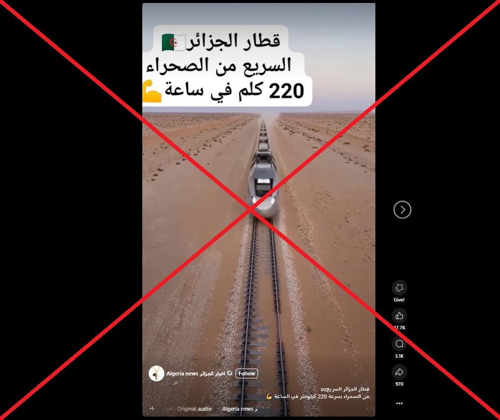آلاف المشاركات والتعليقات حصدها فيديو على صفحات جزائرية في مواقع التواصل الاجتماعي قيل إنه لقطار سريع في صحراء الجزائر. إلا أن الادعاء غير صحيح. فالفيديو ليس مصوّراً في الجزائر، بل في السعودية.