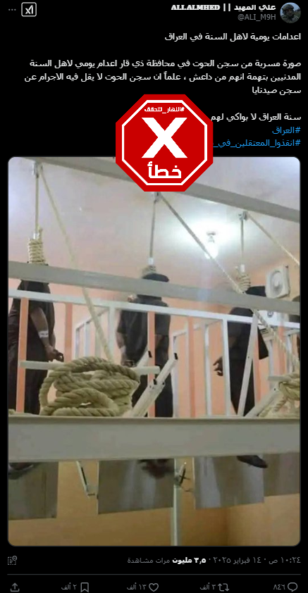تتداول العديد من الصفحات على مواقع التواصل الاجتماعي صورة بمزاعم أنها "مسربة من سجن الحوت في محافظة ذي قار العراقية، وتظهر عمليات إعدام يومية لأهل السنة المدنيين في العراق بتهمة الانتماء إلى تنظيم الدولة الاسلامية (داعش)". إلا أن هذا الادعاء خاطئ، إذ أن الصورة نشرتها وزارة العدل العراقية لإعدام 13 إرهابياً عام 2018. FactCheck#