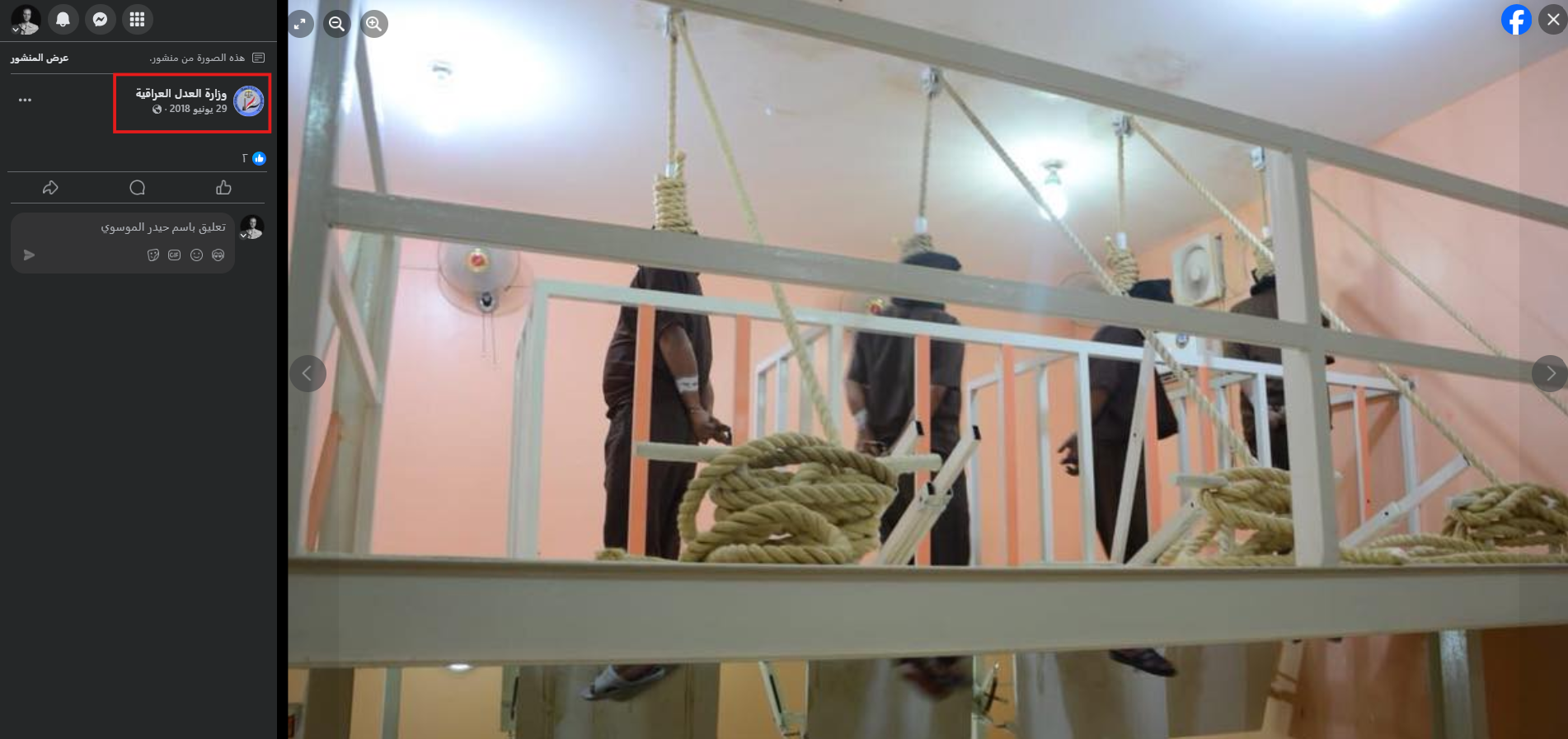 1- نشرت الصورة الصفحة الرسمية لوزارة العدل العراقية على منصة فايسبوك في 29 يونيو/حزيران 2018، وهي لتنفيذ احكام الإعدام بحق 13 شخصا ادينوا، بموجب قانون مكافحة الإرهاب، بالاشتراك بعمليات مسلحة مع مجموعات إرهابية وعمليات خطف وتفجير وقتل مدنيين.