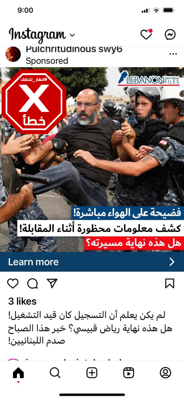 وستقرأون العنوان ذاته في منشور آخر في انستغرام حمل الاسم ذاته، Pulchritudinous swy6، وأرفق بصورة مفبركة للصحافي اللبناني رياض قبيسي مقاوما رجال امن.