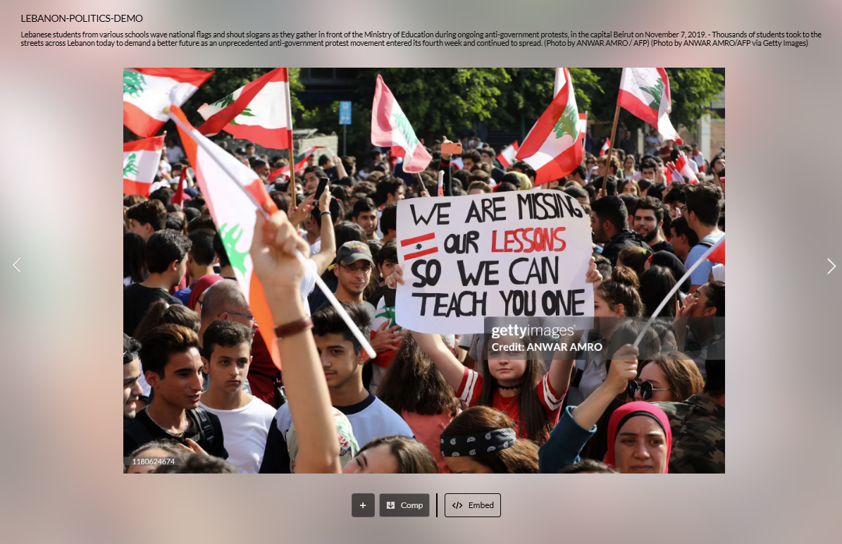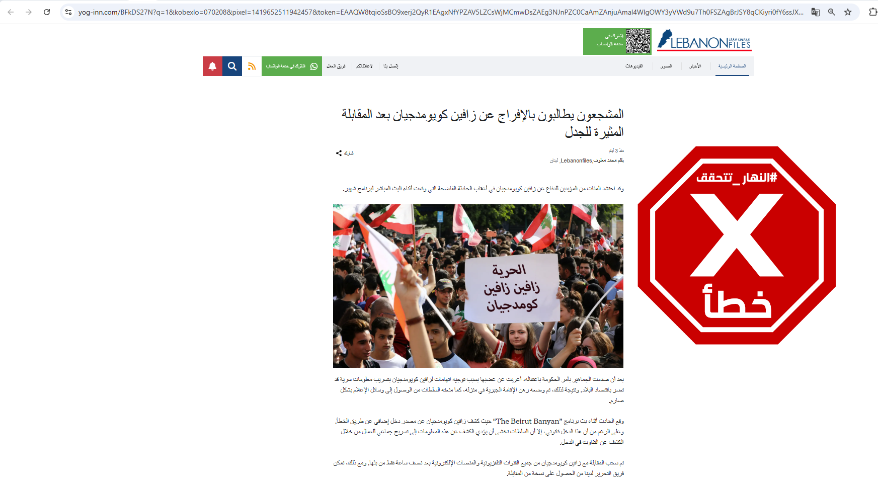 وبالضغط على صورة قيومجيان، سيوصلكم رابط الى صفحة زائفة لها التصميم ذاته لتصميم موقع "ليبانون فايلز"، يعلوها عنوان (من دون تدخل): "المشجعون يطالبون بالإفراج عن زافين كويومدجيان بعد المقابلة المثيرة للجدل"، مع صورة معدّلة، زائفة تظهر فتاة حملت وسط تجمع لافتة كُتب عليها "الحرية زافين زافين كومدجيان" (الاصلية هنا، تظهر طلابا لبنانيين من مدارس مختلفة يلوحون بالأعلام اللبنانية ويرددون شعارات خلال تظاهرة أمام وزارة التربية والتعليم، في اطار احتجاجات مناهضة للحكومة في العاصمة بيروت، في 7 تشرين الثاني 2019- أ ف ب).
