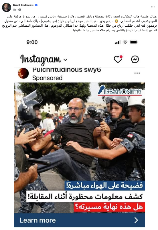 بعد انتشار المنشور الكاذب عنه، حذّر الصحافي رياض قبيسي، عبر صفحته في الفايسبوك، اليوم الاربعاء، من أن "منصة مالية تستخدم اسمي تارة بصيغة رياض قبيصي، وتارة بصيغة رياض قبيسي، مع صورة مركبة على الفوتوشوب انه تم اعتقالي، مرفقة بخبر مفبرك عبر موقع ليبانون فايلز (فوتوشوب)، بالإضافة إلى نص متخيل يزعمون فيه انني حققت أرباحا من خلال هذه المنصة، ولهذا تم اعتقالي المزعوم. وهذا المنشور التضليلي يتم ترويجه عبر إنستغرام للإيقاع بالناس، وستتم ملاحقة من ورائه قانونيا".