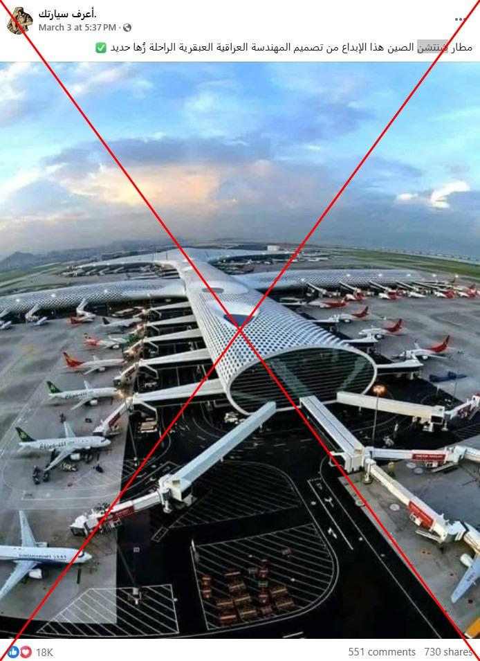تتضمّن المنشورات مطاراً بتصميم غير مألوف. وجاء في التعليق المرفق: "مطار شنتشن الصين... هذا الإبداع من تصميم المهندسة العراقية العبقرية الراحلة زها حديد".