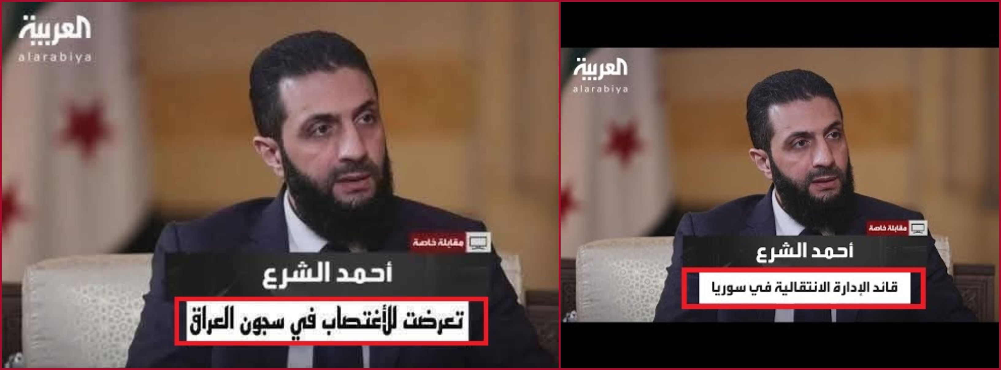 المتداول: صورة للرئيس الانتقالي السوري أحمد الشرع مع تصريح نشرته له قناة "العربية"، وجاء فيه أنه "تعرّض للاغتصاب في سجون العراق".