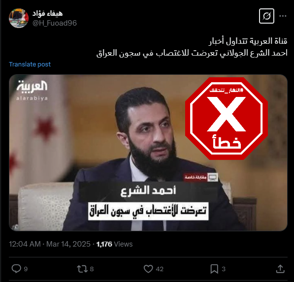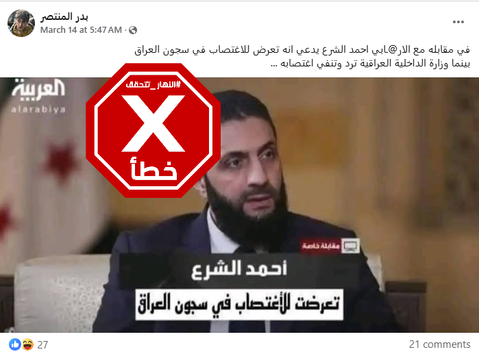 صورة للشرع ببدلة رسمية، حملت شعار قناة "العربية"، بينما كُتب عليها: "مقابلة خاصة- أحمد الشرع: تعرضت للاغتصاب في سجون العراق". وقد تكثف التشارك في الصورة خلال الايام الماضية عبر حسابات ارفقتها بالمزاعم الآتية (من دون تدخل): "في مقابله مع احمد الشرع، يدعي انه تعرض للاغتصاب في سجون العراق"، وايضا "قناة العربية تتداول أخبارا. احمد الشرع: تعرضت للاغتصاب في سجون العراق".