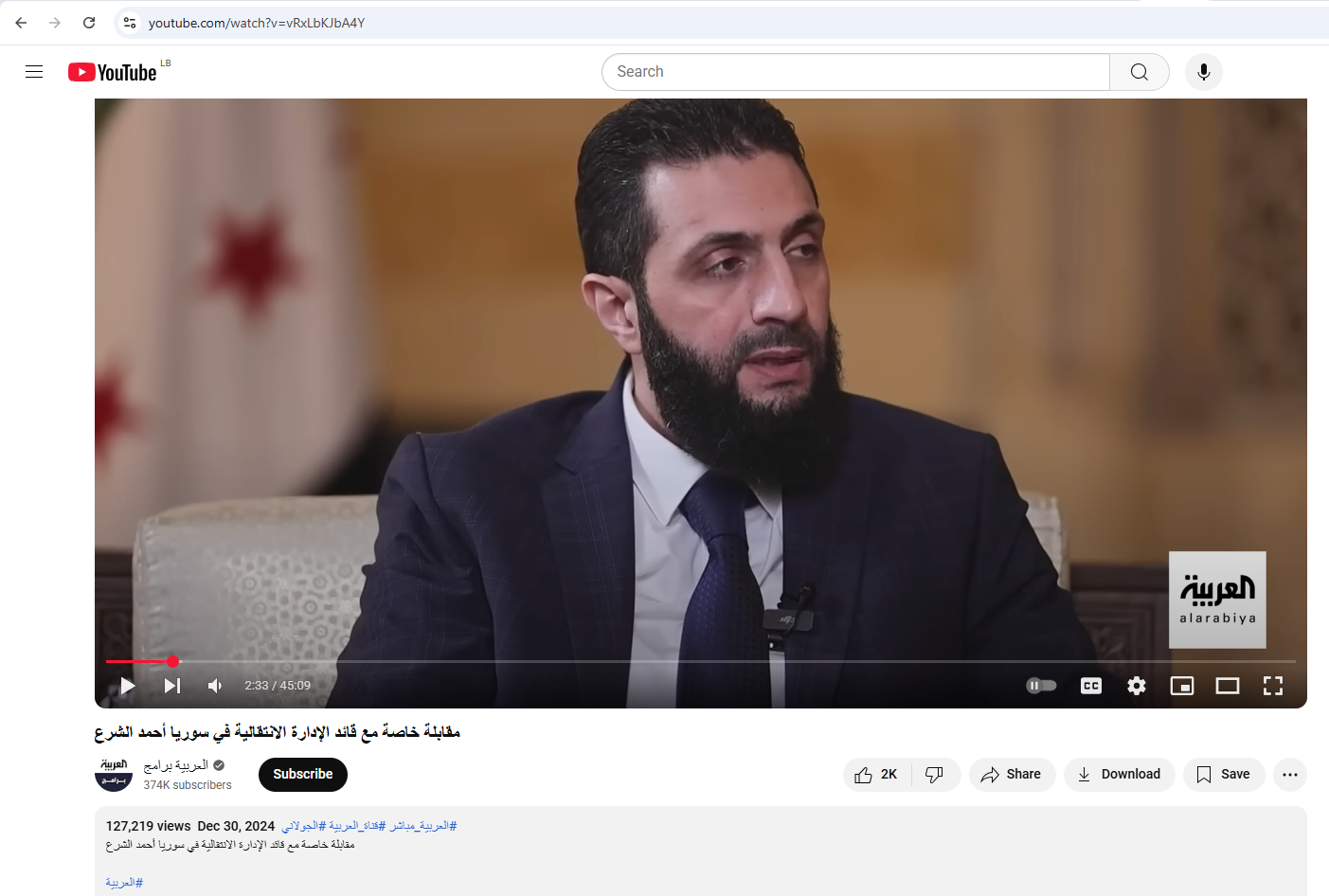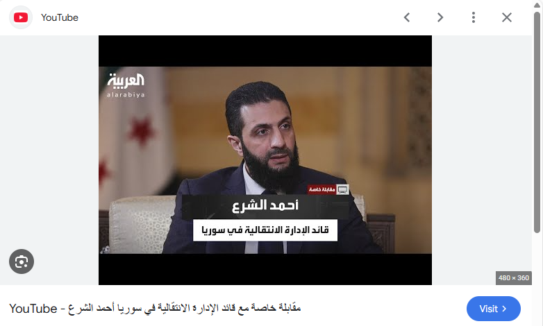 وخلو المقابلة من الكلام المنسوب الى الشرع يعني ان التصريح المتناقل له زائف، مختلق. وقد أمكننا التوصل الى الصورة الاصلية لقناة "العربية"، والتي استُخدمت في عملية الفبركة، محفوظة في موقع غوغل، ضمن رابط يقود الى المقابلة الكاملة مع الشرع في حساب "العربية برامج" في يوتيوب.
