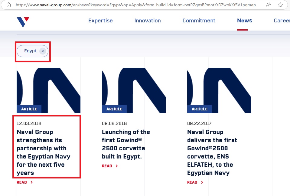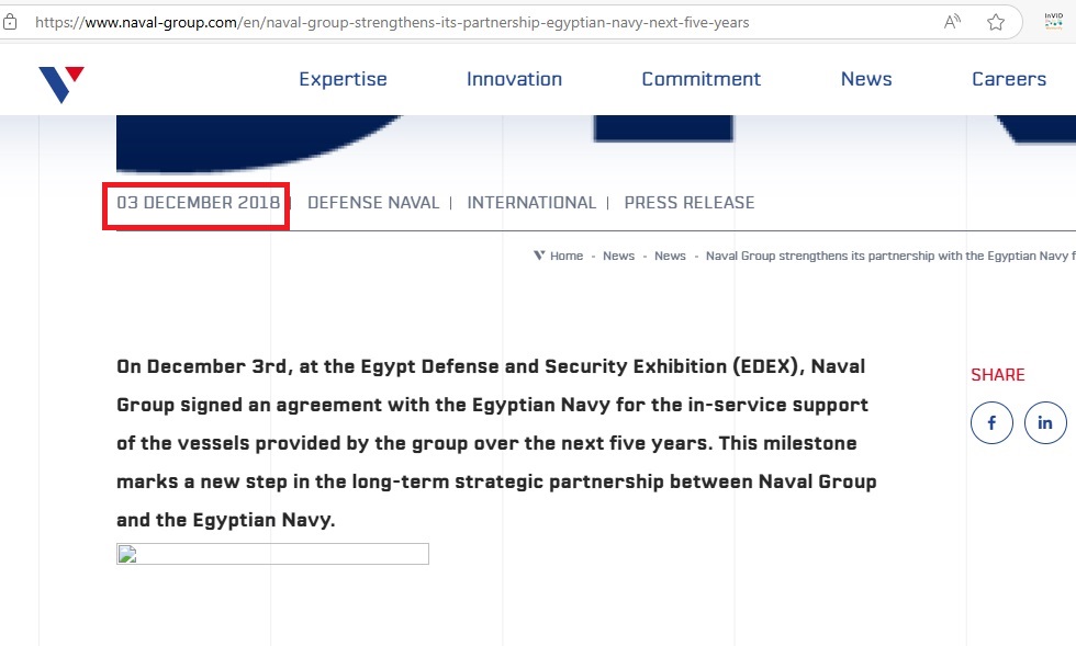 وآخر خبر نشره الموقع الرسمي للشركة الفرنسية حول مصر كان بتاريخ 3 كانون الأول (ديسمبر) 2018، بعنوان: "مجموعة نافال تعزز شراكتها مع البحرية المصرية للسنوات الخمس المقبلة".
