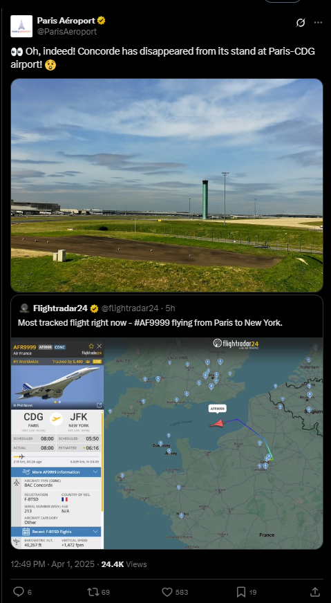 منذ ساعات، تتجه العيون صوب حساب Flightradar24 في اكس، والذي يتتبع حركة الطيران من جميع أنحاء العالم، وذلك بعدما نشر أخبارا عن عودة طائرة الكونكورد الى التحليق في رحلات عدة. وجاء في منشور: "الرحلة الأكثر تتبعًا في الوقت الحالي- رقم الرحلة AF9999 المتجهة من باريس إلى نيويورك". واضاف ان الطائرة التي تجري هذه الرحلة هي "كونكورد تابعة للخطوط الجوية الفرنسية".