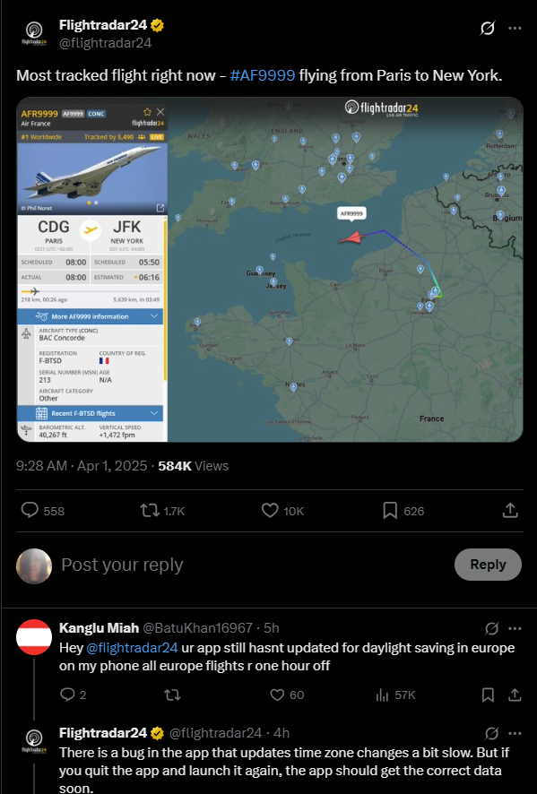 في الواقع، جاءت اخبار Flightradar24 في اطار كذبة أول نيسان. وقد تفاعل مستخدمون مع الحساب بتعليقات طريفة بينوا فيها انهم لم يقعوا في فخ هذه الكذبة.