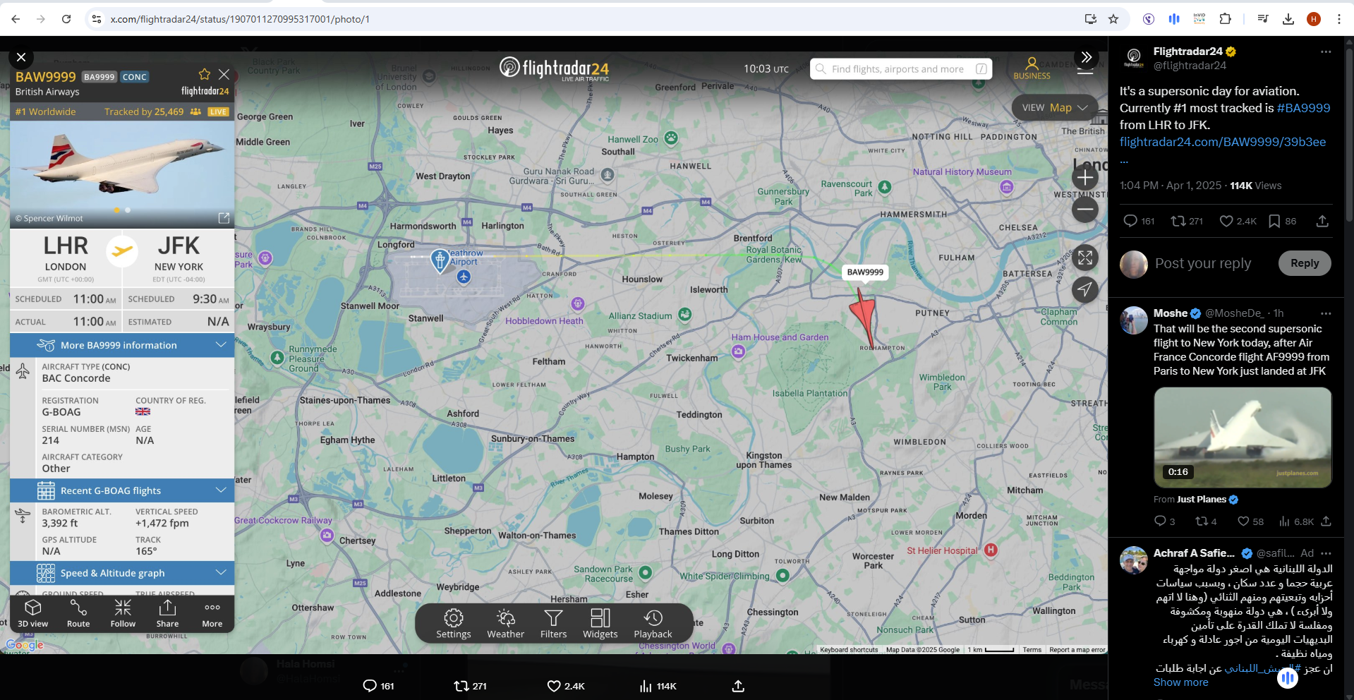 كذلك، ذكر الحساب في منشور آخر ان طائرة كونكورد أخرى تابعة للخطوط البريطانية هي في رحلة من مطار هيثرو بلندن الى مطار جون إف كينيدي الدولي في نيويورك. و"رحلتها الرقم BA9999 هي الأكثر تعقباً حاليًا".