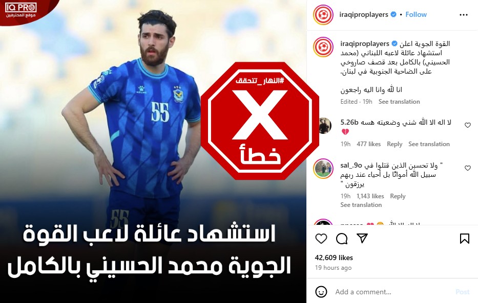منذ ساعات، ينتشر الخبر على نطاق واسع في وسائل التواصل الاجتماعي. وجاء فيه (من دون تدخل): "نادي القوة الجوية اعلن استشهاد عائلة لاعبه اللبناني محمد الحسيني بالكامل بعد قصف صاروخي على الضاحية الجنوبية في لبنان".