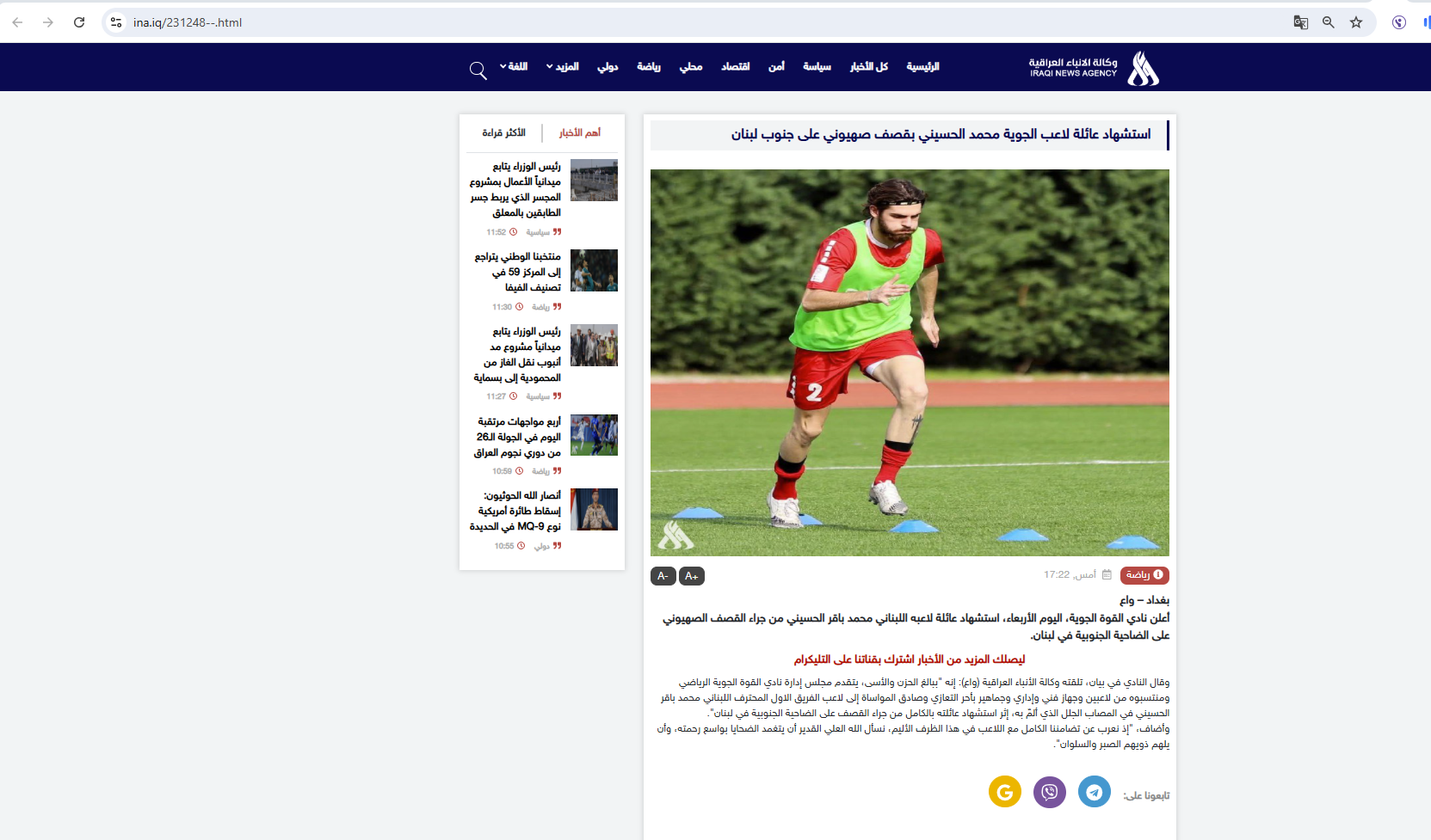 نعم، ما ذكرته المنشورات صحيح. فقد أصدر نادي القوة الجوية العراقي، امس الأربعاء، بيانا اعلن فيه "استشهاد عائلة لاعبه اللبناني محمد باقر الحسيني من جراء القصف الصهيوني على الضاحية الجنوبية في لبنان". وقد نشرته وكالة الانباء العراقية (واع)، وجاء فيه: "ببالغ الحزن والأسى، يتقدم مجلس إدارة نادي القوة الجوية الرياضي ومنتسبوه من لاعبين وجهاز فني وإداري وجماهير بأحر التعازي وصادق المواساة إلى لاعب الفريق الاول المحترف اللبناني محمد باقر الحسيني في المصاب الجلل الذي ألمّ به، إثر استشهاد عائلته بالكامل من جراء القصف على الضاحية الجنوبية في لبنان".