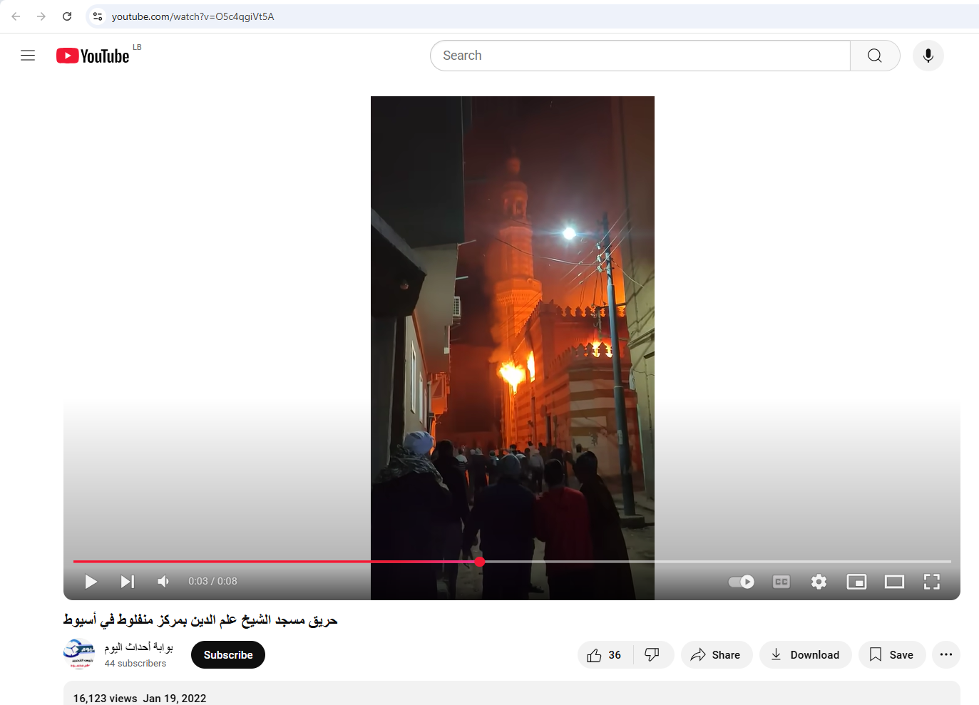 فالبحث عن المقطع، بتجزئته الى مشاهد ثابتة (Invid)، يوصلنا الى مواقع اخبارية وحسابات، لا سيما مصرية، نشرته او نشرت لقطة ثابتة مماثلة تماما، في 19 كانون الثاني 2022، بعنوان: "حريق مسجد الشيخ علم الدين بمركز منفلوط في أسيوط".