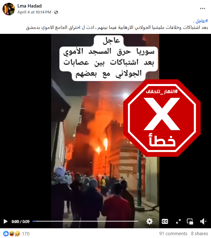 المتداول: فيديو يظهر، وفقاً للمزاعم، "احتراق الجامع الاموي في دمشق نتيجة اشتباكات بين عصابات أبو محمد الجولاني"، اللقب السابق للرئيس الانتقالي السوري أحمد الشرع.
