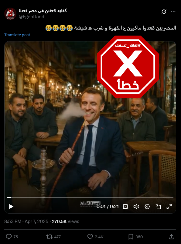 تقييمنا النهائي: اذاً، ليس صحيحاً ان المقطع المتناقل يظهر "الرئيس الفرنسي ايمانويل ماكرون مدخنا الشيشة خلال زيارته مصر أخيرا". في الحقيقة، هذه المشاهد ليست حقيقية، لكونها مولدة بالذكاء الاصطناعي. وقد أنشأها الفنان الرقمي علي الطويل Ali Altawil ونشرها بهذا الوصف في حساباته في 7 نيسان 2025.