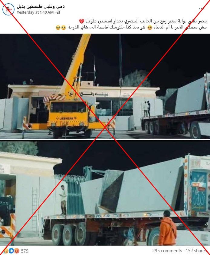 تتضمّن المنشورات صورتين تظهران رافعة وشاحنات تنقل حواجز إسمنتية. وجاء في التعليق المرفق "مصر تغلق معبر رفح من الجانب المصري بجدار إسمنتي طويل".