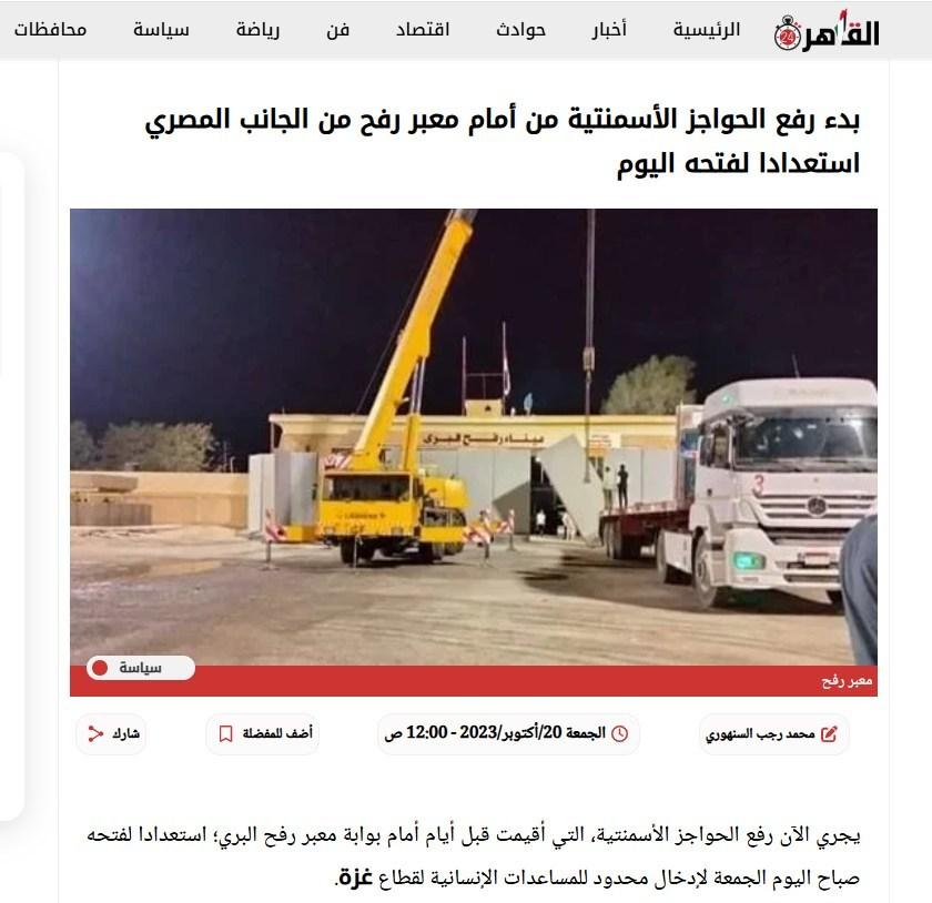 وبحسب ما جاء في الأخبار المرفقة بالصور والفيديو آنذاك، أزالت السلطات المصريّة في 20 تشرين الأول/أكتوبر 2023 حواجز إسمنتية لإتاحة دخول المساعدات إلى قطاع غزّة.
