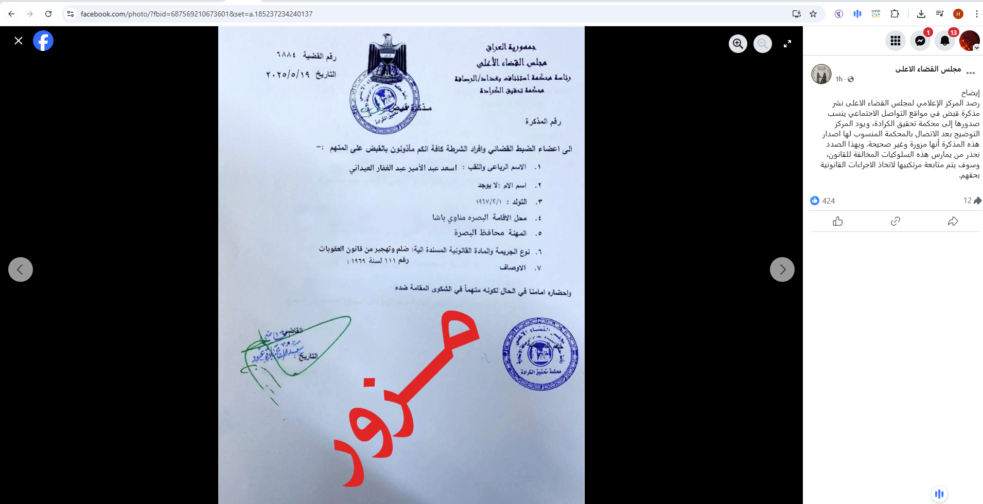 تتداول العديد من الصفحات على مواقع التواصل الاجتماعي خبراً يدّعي أنَّ مذكرة إلقاء قبض واستقدام صدرت بحق محافظ البصرة أسعد العيداني، بالتزامن مع الخلاف الذي نشب بينه وبين رئيس الوزراء العراقي محمد شياع السوداني بشأن قضية رفع المنازل المخالفة في محافظة البصرة جنوب العراق. إلا أنَّ الخبز خاطئ، والوثيقة المتداولة مفبركة. وأكد مجلس القضاء الأعلى انها "مزوّرة". FactCheck#