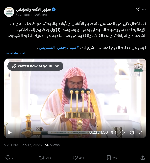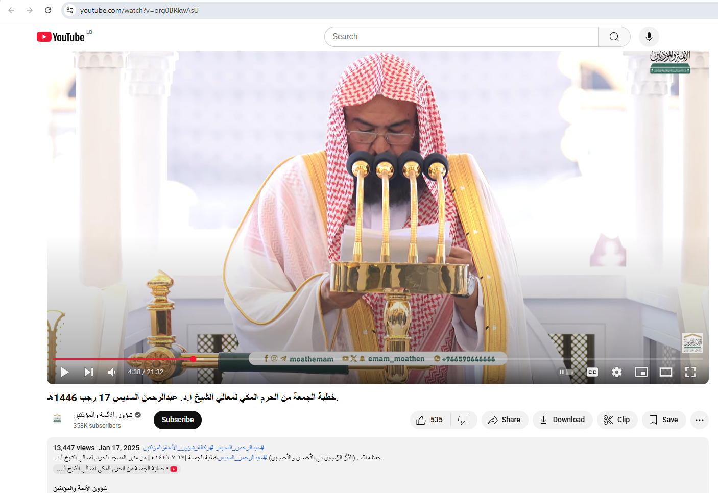 ويتأكد هذا التلاعب بالعثور على المشاهد الاصلية للشيخ السديس منشورة في حساب شؤون الأئمة والمؤذنين في يوتيوب، في 17 كانون الثاني 2025، بعنوان: خطبة الجمعة من الحرم المكي لمعالي الشيخ أ.د. عبدالرحمن السديس 17 رجب 1446هـ.