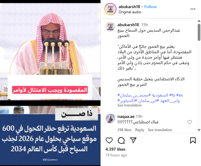 تظهر المشاهد إمام وخطيب المسجد الحرام الشيخ عبدالرحمن السديس قارئا ورقة، قائلا: "يسأل بعض الناس عن إعلان ولي العهد الأمير محمد بن سلمان رفع الحظر عن تقديم الخمور في الأماكن السياحية. وهنا يجب أن نؤكد على مقاصد الشرع في هذا الباب، يعتبر تقديم الخمور جائزا في الأماكن المقصودة، ويجب الامتثال لأوامر ولي الأمر. أما في المناطق الأخرى من البلاد، فننتظر فيها أوامر جديدة،  وتبقى في موضع المحرم حتى يأذن ولي الأمر بغير ذلك". وكُتِب على الفيديو (من دون تدخل): "السعودية ترفع حظر الكحول في 600 موقع سياحي بحلول العام 2026 لجذب السياح قبل كأس العالم 2034".