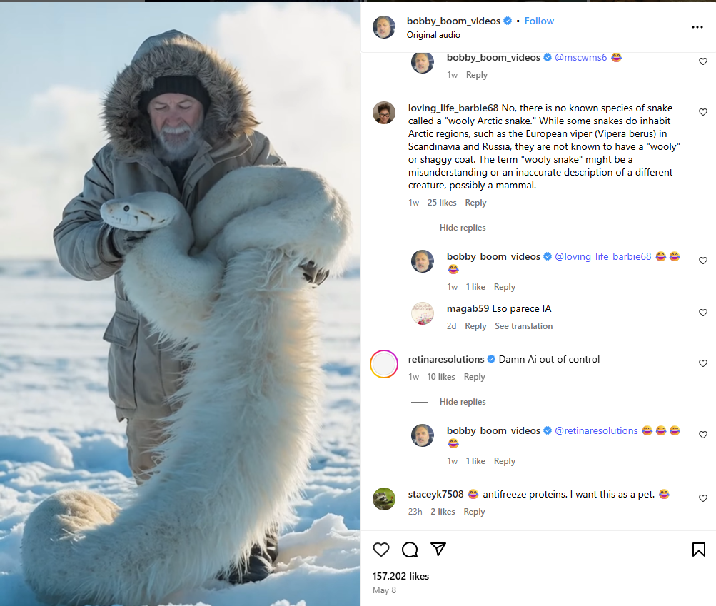 ومع ان Bobby Boom، أو بوبي بريل Bobby Brill، كما يعرّف باسمه في انستغرام، لم يحدّد ماهية هذه المشاهد، الا ان تفاعله مع تعليقات متابعيه حمل في طياته اعترافا ضمنيا بأن مقطعه غير حقيقي. فلما واجهه أحدهم بانه "لا يوجد نوع معروف من الثعابين يُطلق عليه اسم ثعبان القطب الشمالي الصوفي"... ردّ بوجه ايموجي غارق في الضحك. كذلك، علّق بإيموجي ضاحك على قول آخر "اللعنة، الذكاء الاصطناعي خارج السيطرة". ولما أثنى أحدهم على عمله الابداعي في الذكاء الاصطناعي، رحّب بتعليقه.