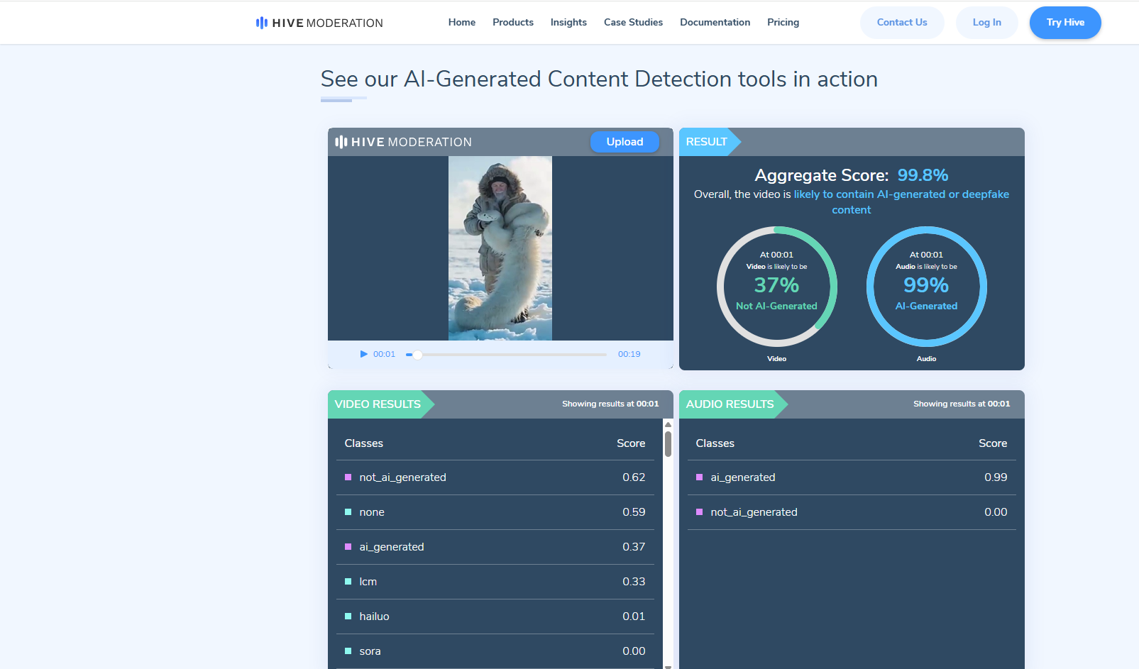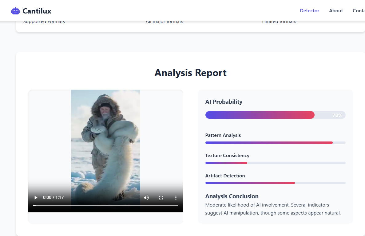 وتدعم هذا الاستنتاج نتيجة فحص الفيديو في مواقع متخصصة بكشف الصور والفيديوات الزائفة، مثل Hive Moderation وCantilux، والتي جاءت انه منشأ بالذكاء الاصطناعي.